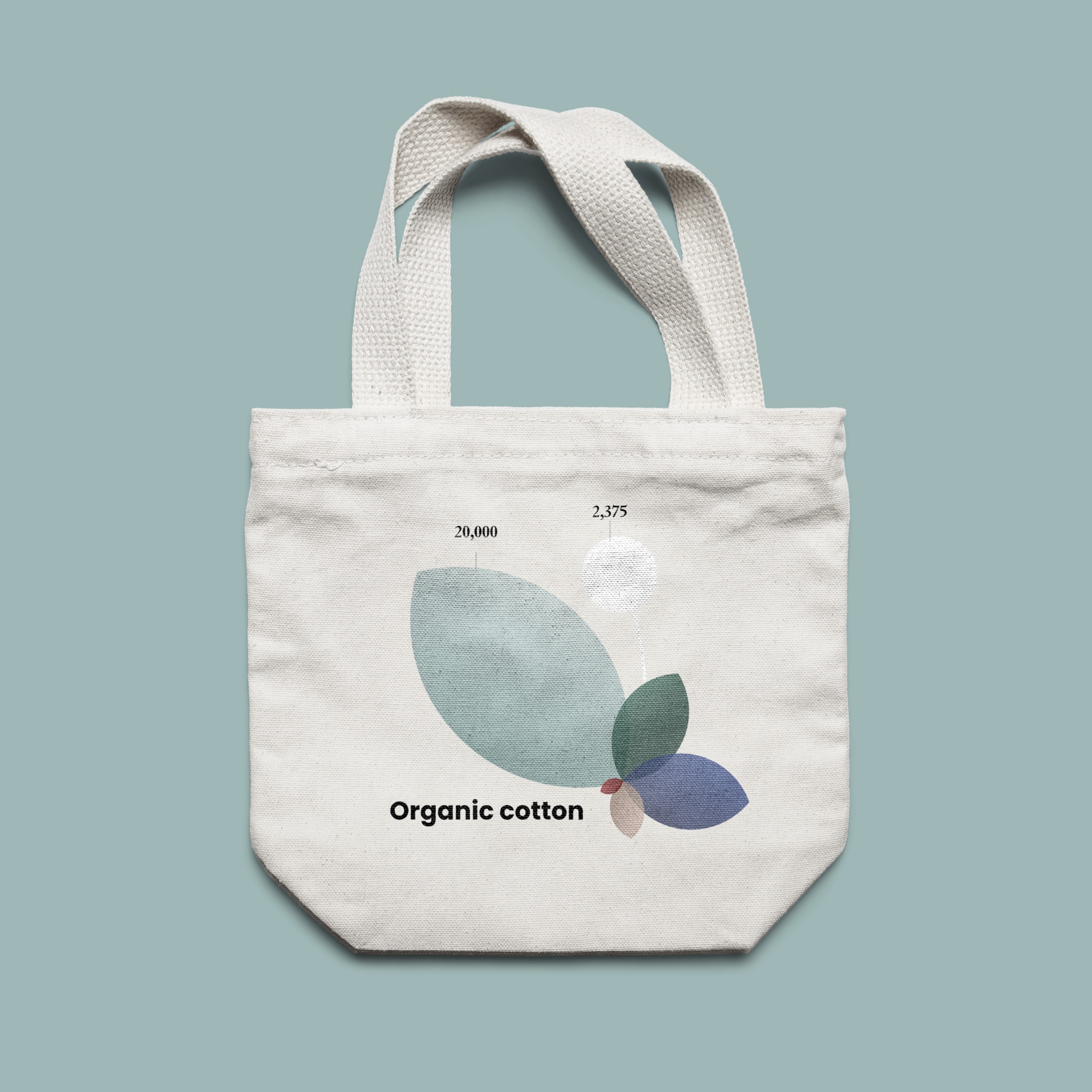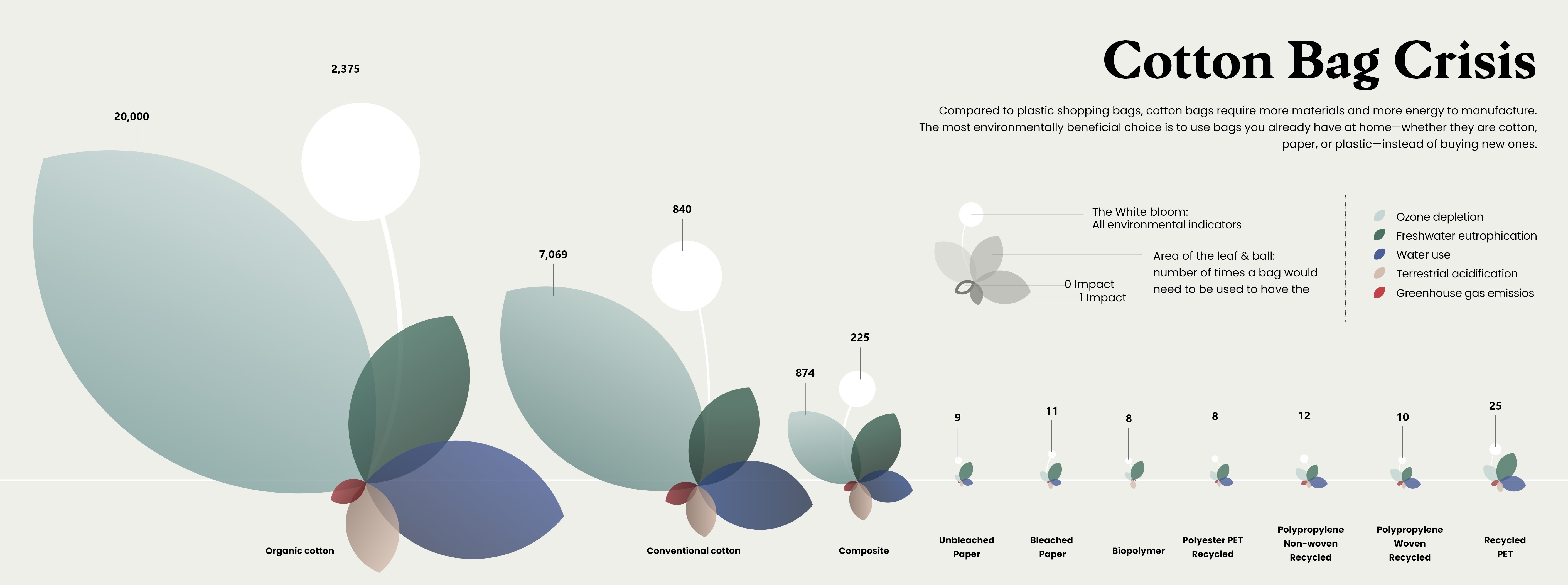 为了更好地理解棉布袋和其他材料之间的环保差异,我从棉花的形状中汲取灵感将其视觉化,以对比不同材料数据,揭示出各类材料在环境影响上的巨大差距。
