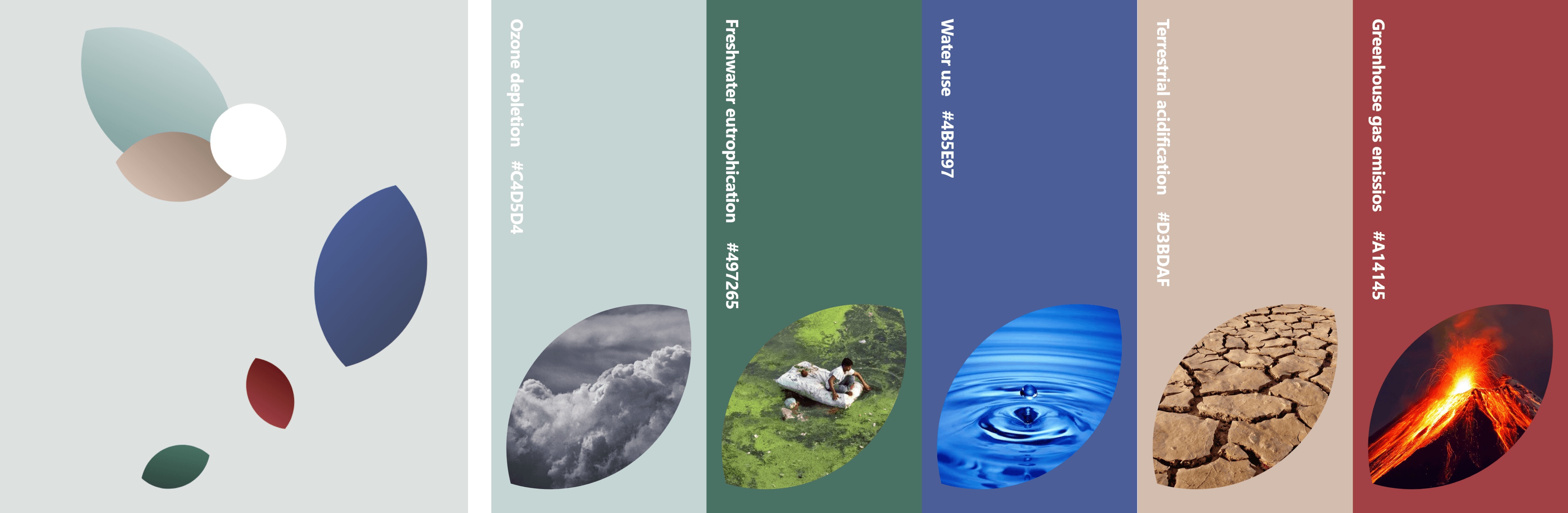 参考棉花的形态为主要灵感来源进行设计,暗示对棉布包的溯源。从材料不同数据对应的环境影响所产生的实际现象中提取色彩,形成了基础的可视化视觉印象。