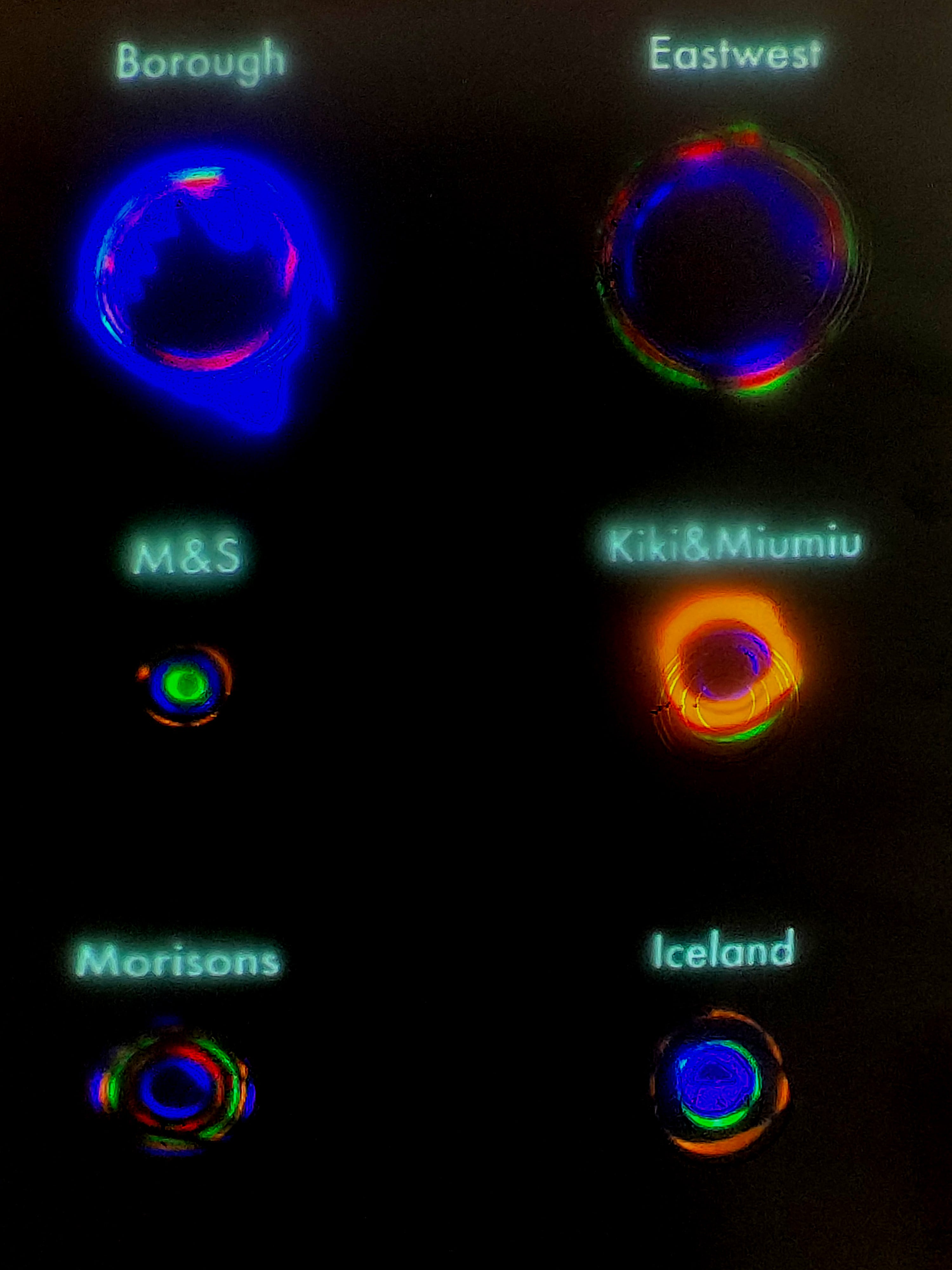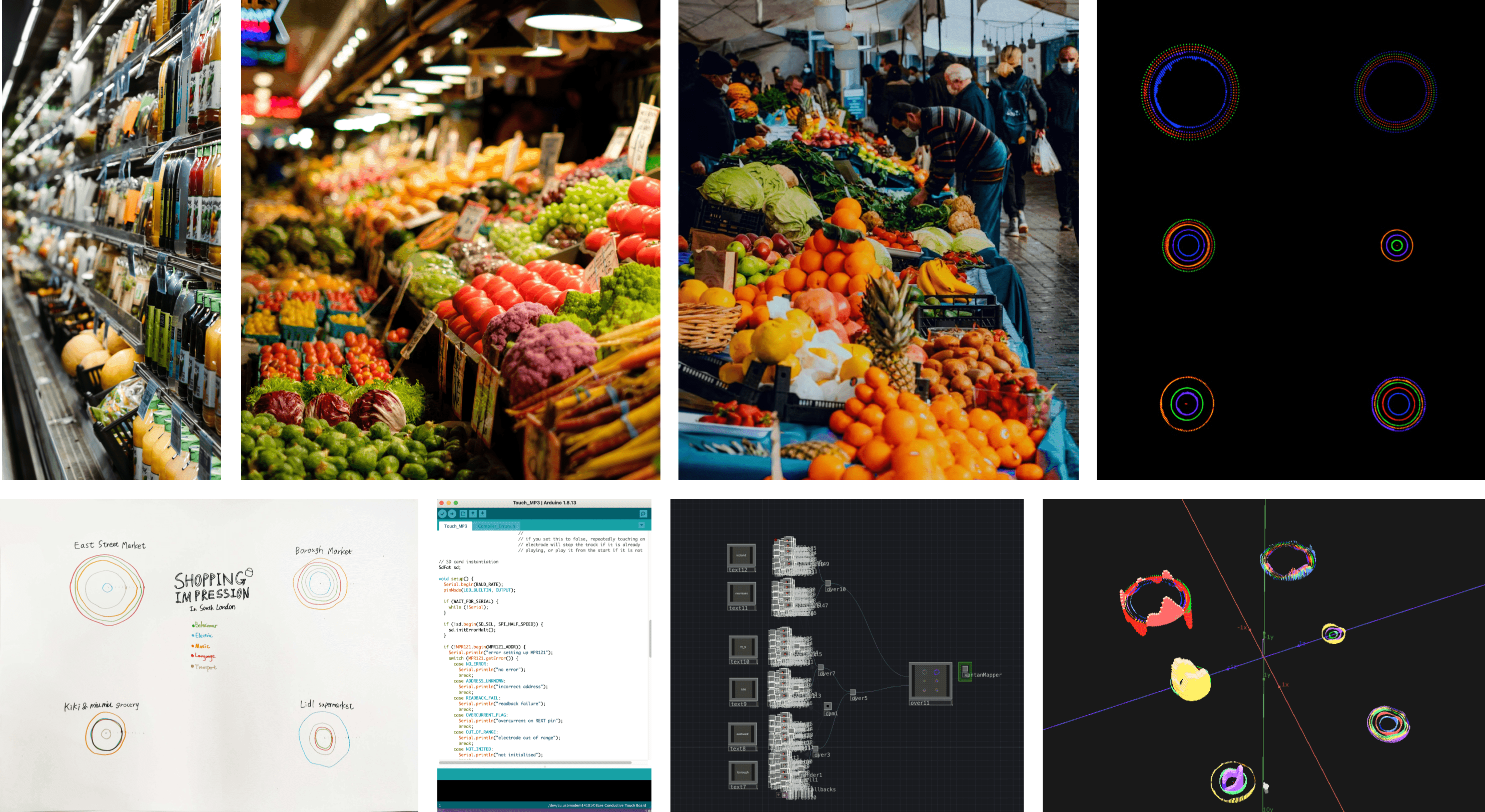 在该项目中,我们探索了伦敦南部 6 个不同购物地点的整体声音体验感知,以不同颜色的圆圈代表不同类型声音,以创建互动装置,观众触摸圆圈将会播放对应的动画和声音。通过分别触摸上、中、下不同市场中的圆圈,观众可以DIY自己的购物氛围,创建身临其境的先觉体验。