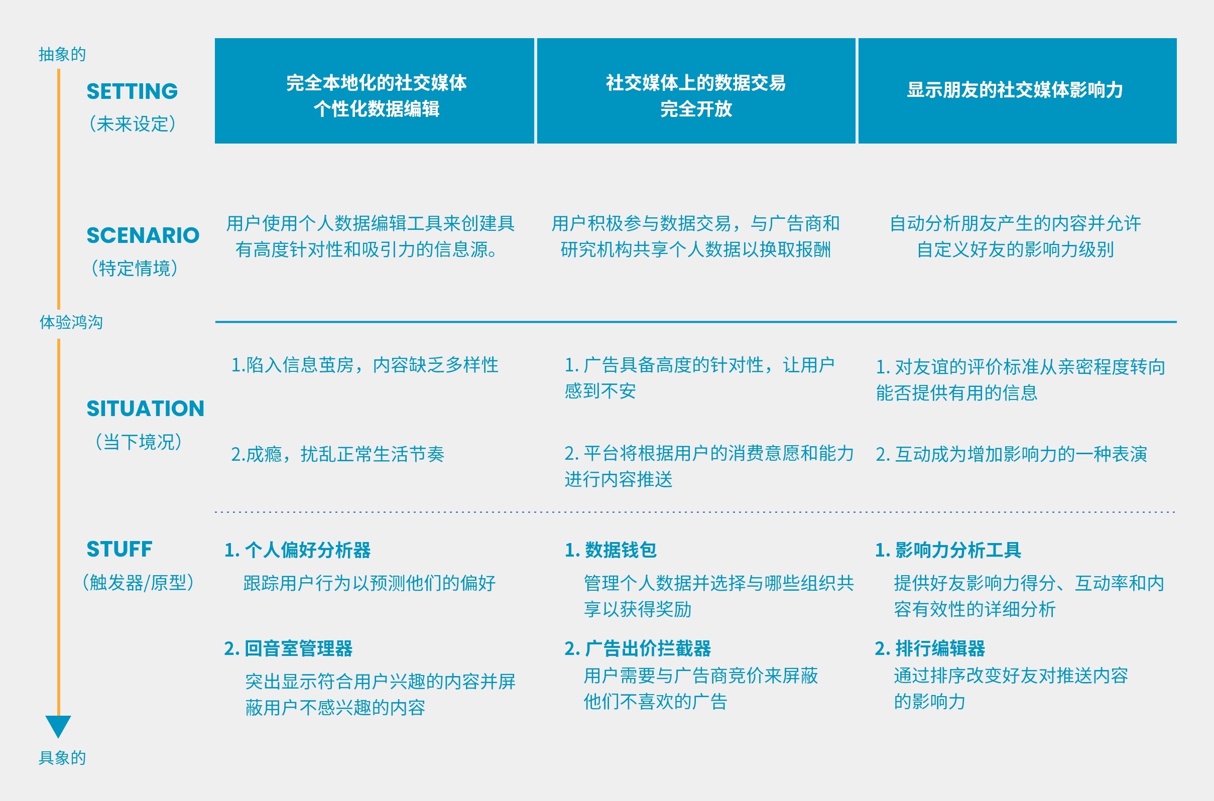 After collecting enough materials, I used the Experiential Futures Ladder as a tool to transform abstract future concepts into concrete prototype concepts.