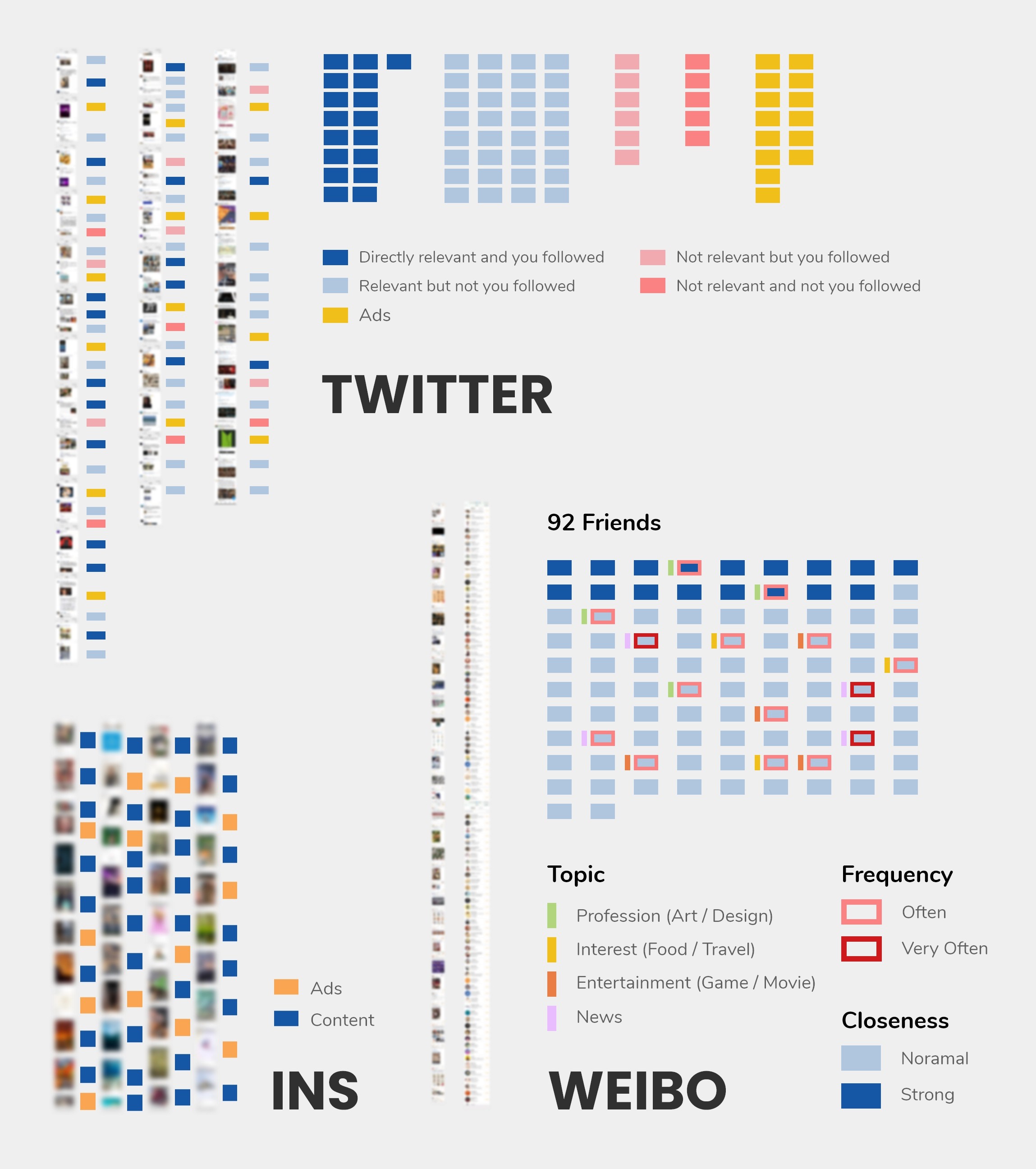 In the early stages of the project, I conducted extensive collection and analysis of users' social media content. The goal was to understand their perceptions of information flow and algorithmic recommendation mechanisms. I performed three types of mapping from different perspectives on social media platforms: