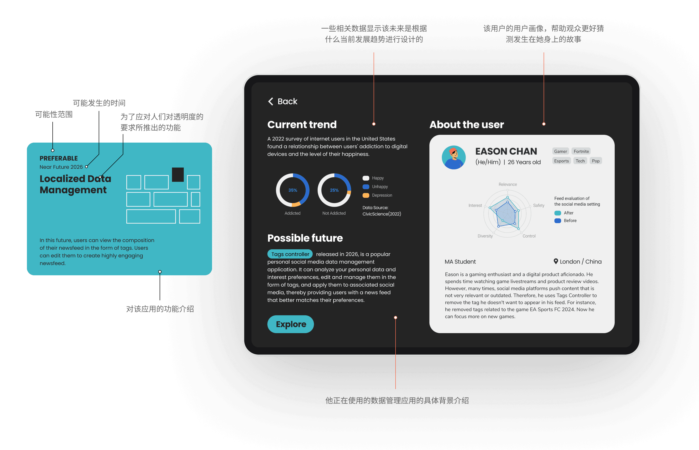 As a product of speculative design, I do not need the complete feasibility of the prototypes. Instead, I strive to infuse a future-oriented tone into the visual language while maintaining a certain level of credibility. To achieve this, I simplified the complexity of charts and user interfaces to enable quick recognition and judgment of information by audience.