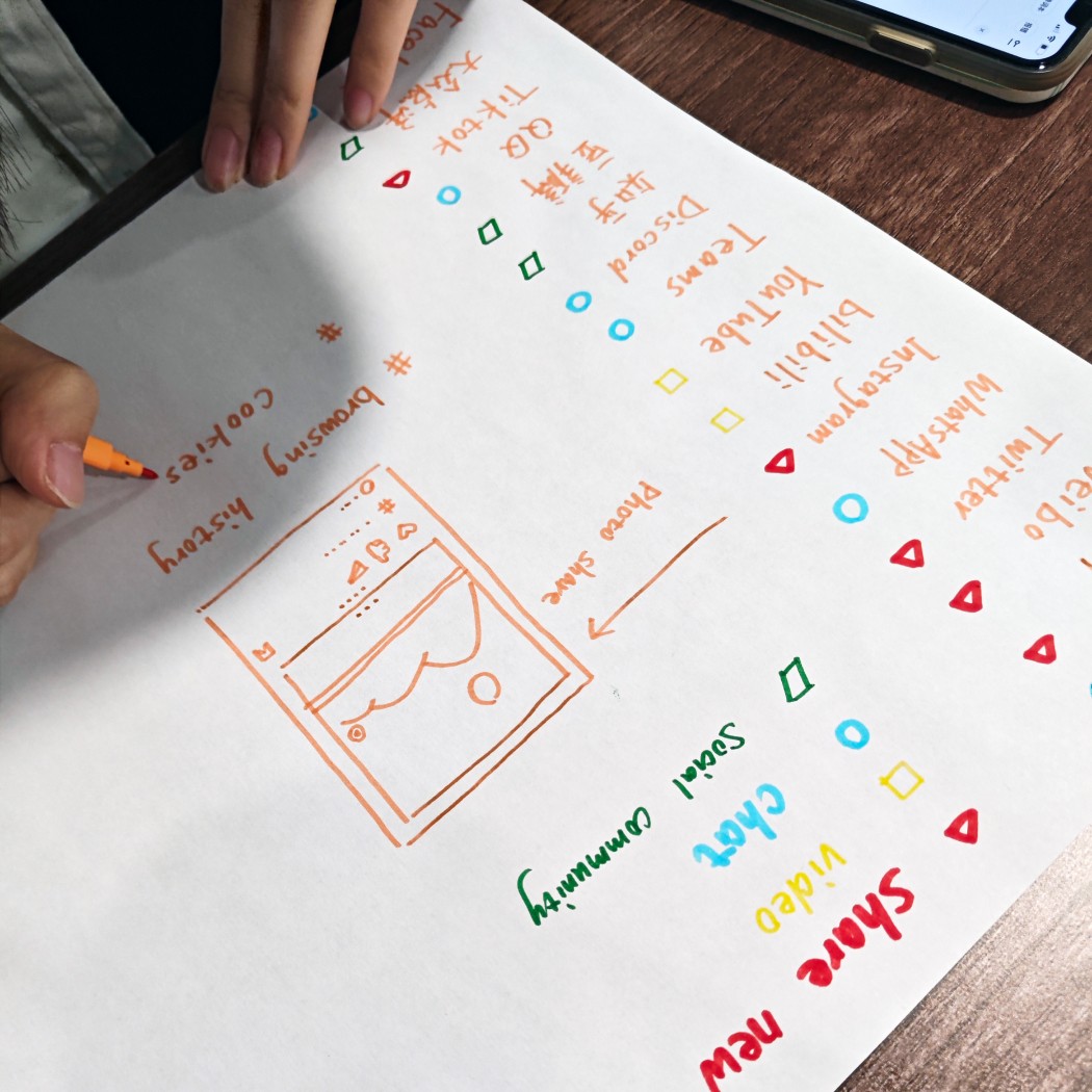 I designed and organized a multi-participant workshop, asking participants to analyze their social media usage through hand-drawing. The workshop was divided into three topics: