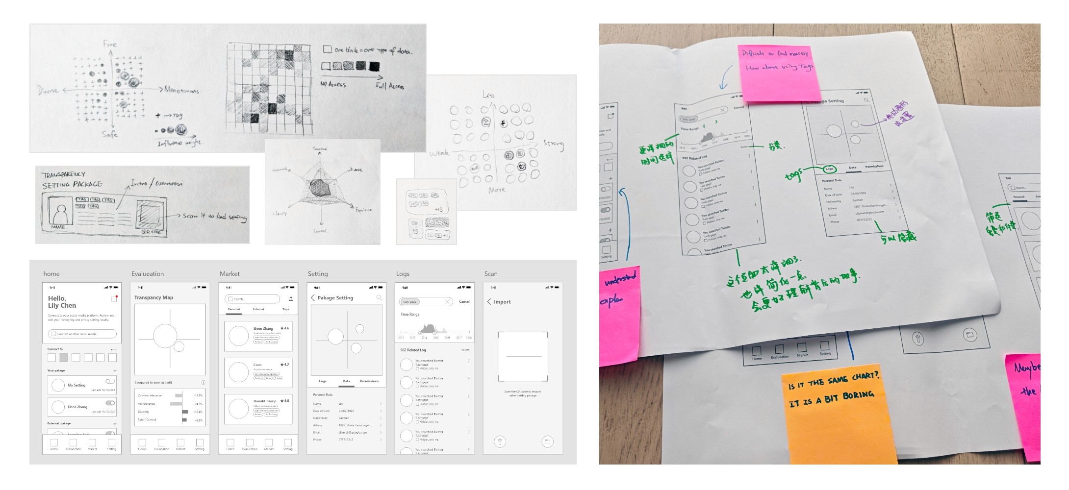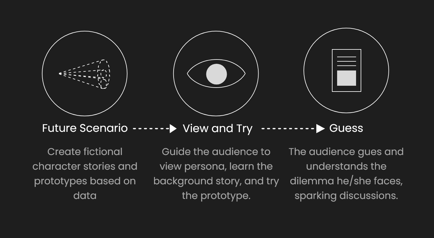 After collecting the data, a UI prototype is created based on the data as an artifact/trigger. Audience members are guided to try the prototype, and then, based on the visualized data in the prototype, they speculate the dilemmas (situation puzzles), which triggers discussions about transparency.